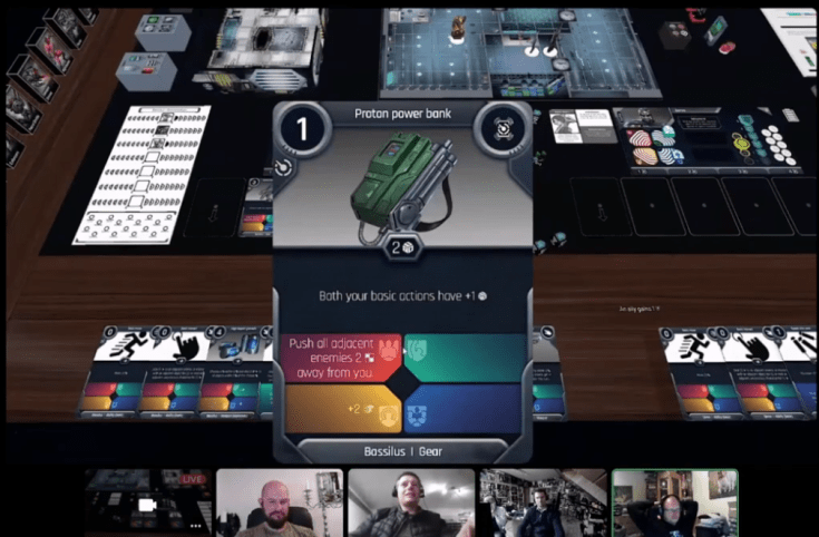 Jenders Gaming during a playthrough with the game designer (Emil) on Tabletop Simulator talks about using an effect card (one of the action cards).