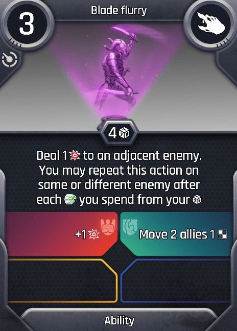 Deal 1 damage to an adjacent enemy. You may repeat this action on the same or different enemy after each move you spend from your dice.