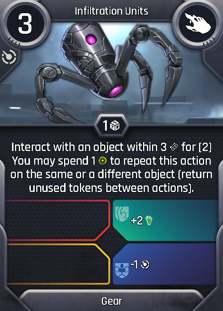 Hero: Gia – [Card was updated from the prototype] Gia is the only hero who can interact with TWO objects during the same action. Plus either or both objects can be at range 3 (does not need to be adjacent). You can even interact with the same object TWICE. Note that the second time performing the interact costs 1 focus. Plus a die roll can increase the number of interact tokens each time (up to 4 interact tokens each time with a +2 die roll).