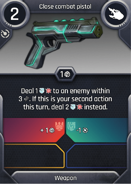 The Close Combat Pistol may only deal 1 unblockable damage, but it has a range of 3. Plus if you use it as your second action, it does double damage! The die roll is not connected with this action.