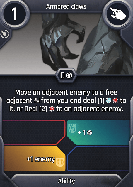 Armored Claws could do up to 3 unblockable damage after moving an enemy to a different adjacent square (using a green token to add a die and getting a good die roll of +1 or +2). Or if an enemy has no shields you can choose to do 2 damage (or up to 4 with a die added by a green token and rolling a +1 or +2). Use a yellow token to do this to TWO enemies!