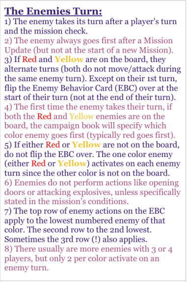 It is important to remember the Enemy Standards and Enemy Priorities, so I formatted them to fit perfectly on a card the same size as the Enemy Behavior Cards (EBC). I also formatted other important information about the enemy behavior to also fit that size.