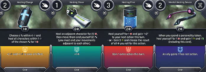 Gunship Revolution completed the last illustrations for the shared action cards. Now all the loot, extra gear, weapons, deployable droids and mines are ready! Shared Action Cards belong to the whole team and are shared between all team members before beginning a mission [Len: you can change who gets which cards with each mission if you wish] Here are four examples dealing with healing and recovery: