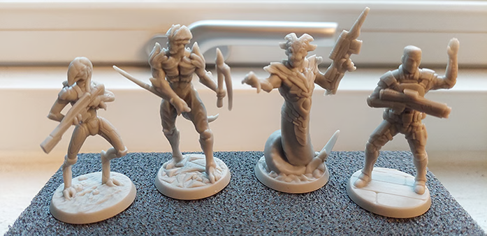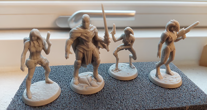 Dan at Prime Prints in the UK made two additional sets of 3D hero miniatures. They have a base of 28mm… ideal for the maps! For those who like miniatures (models) in their games, Emil provided a photo of them all: