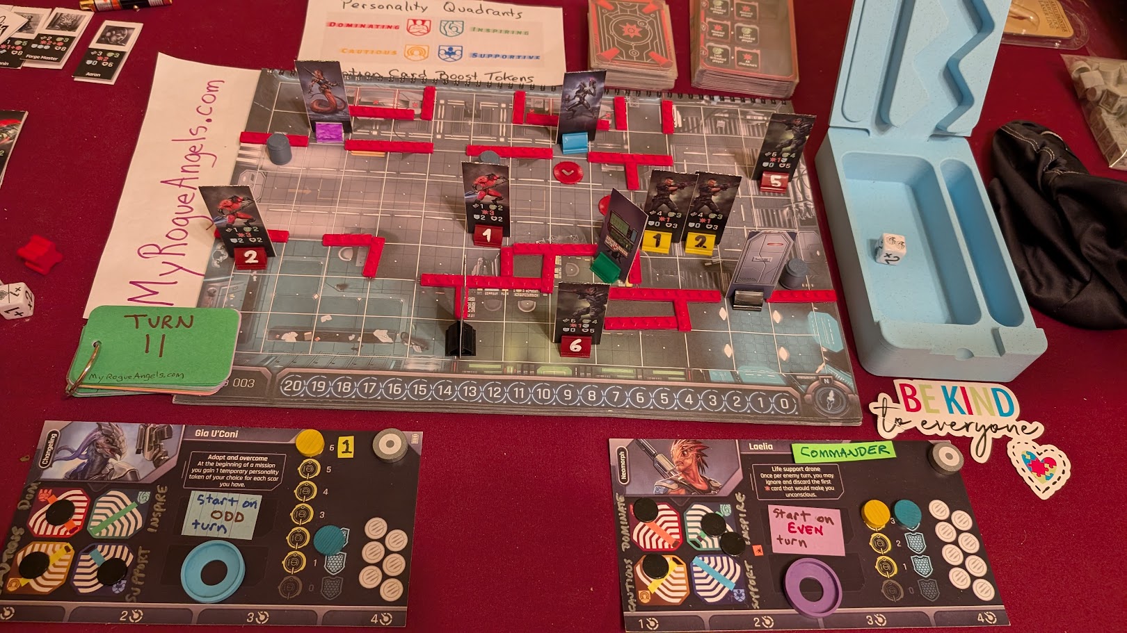 But one final strategic note that ties into another intriguing aspect of Rogue Angels … the enemies alternate activation. First RED will activate (and yellow will do nothing) and then after my next turn the YELLOW will activate (and red will do nothing). However, if I destroy all the yellow enemies, then red will move after all my turns! And the red enemies were quite powerful, so I did not want them to activate every time … so I only destroyed ONE of the yellow and left the other yellow fatally wounded but still on the board (thus yellow still would activate every other turn).
