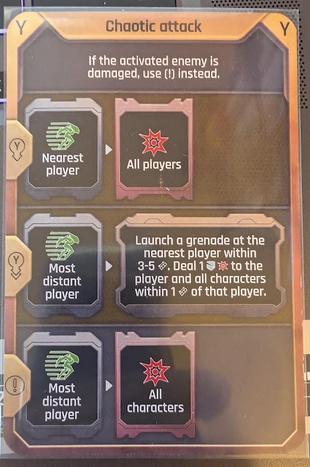 And this brings up yet another intriguing aspect of Rogue Angels … the Enemy Behavior Cards (EBC). The enemies behave differently depending upon the situations in the game (there are dozens of different behaviors). And some of the behaviors include having enemies behave differently if they are damaged …and this WAS part of the EBC that activated for yellow: