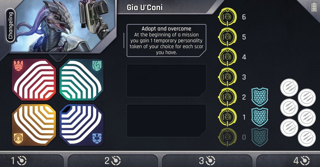 But if your dice roll is “bad”, you can always chose one (or more) of the dice to reroll (and do this one at a time to see how your rerolls go). And it is worth noting that Gia has the highest reroll capacity of all the heroes as you can see from her character sheet (the yellow circle icons are to track rerolls):
