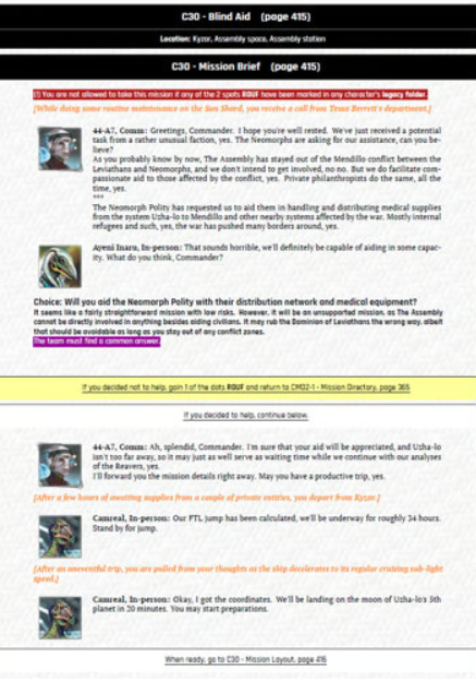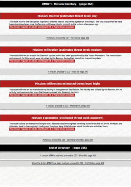 With the help of some backers doing proof reading, Emil was able to correct nearly 3,000 errors in the Campaign Books (primarily typos and grammar, but other mishaps which are inevitable in over 1,000 pages)Emil also has now finished making the page references in the 1,000 page campaign to be dynamic. This will allow a precise and color-coded reference no matter what page you are on. [Len’s note: I have been using the “new” style of campaign books for a while now and they are much much much better. The style that Emil came up with works really well to make reading through the campaign flow smoothly as well as taking care of the “make your own adventure” style of story] Here are four examples that Emil gave: