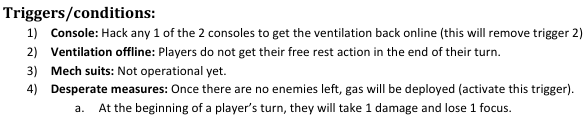 UPDATE: This is very important (and only takes up one line)… even with the reminder I just played C22 update#2 (which DOES have that reminder) and I still forgot to have the enemy go first (too busy planning my strategy in my mind) so I had to replay that mission over again (still successful, but at least it was legitimate:) - Nov7: Missing Room Label: Campaign book page 87 Instructions refer to a “control room” but none of the rooms on the map are labeled so I don’t know which room is being referred to (or at least indicate which room it is as part of the text).