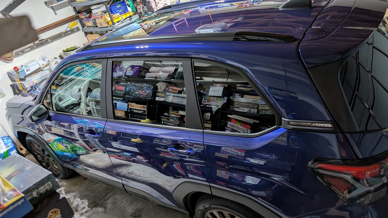 Right after I had made my own complete playable set and thought it was way too good to simply call “Print and Play”, and came up with “Travel Edition” I had just washed my car and noticed the reflection on it when parked in my garage where I have dozens of board games on utility shelves (mostly ones that we don’t play often). One shelf was still empty… so if you look closely at this photo of my car, you might notice something in the center of the photo: